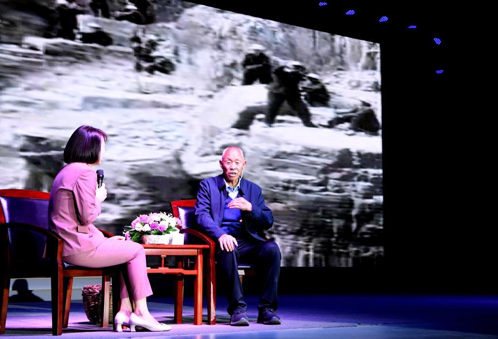 张买江(右)在红旗渠干部学院向学员讲述当年修渠的情景(2025年3月26日摄)。新华社记者郝源摄