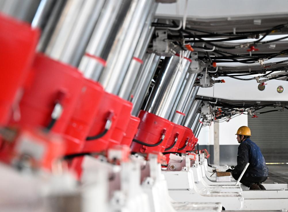 工人在林州重机集团股份有限公司液压支架总装车间进行安装调试作业(2025年3月19日摄)。新华社记者李嘉南摄