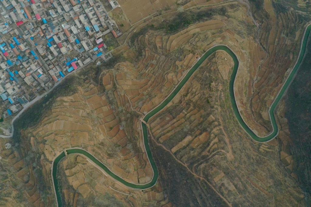 在河南省林州市任村镇阳耳庄村拍摄的红旗渠总干渠(2025年3月25日摄,无人机照片)。新华社记者郝源摄