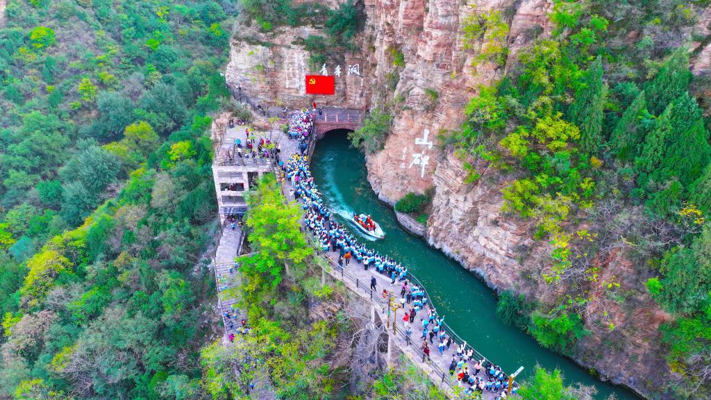 2025年4月5日,学生在河南省林州市红旗渠青年洞开展研学活动(无人机照片)。新华社发(王梓骅摄)