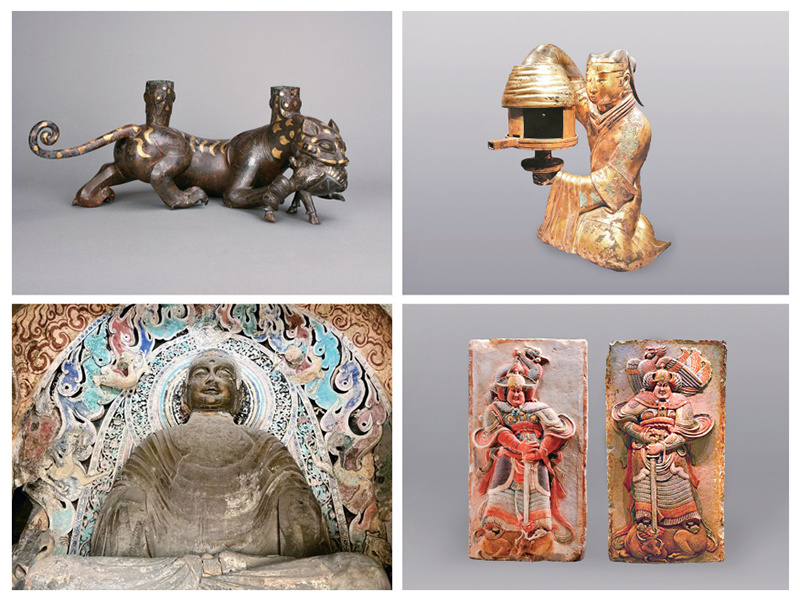 燕赵大地,文脉悠长,如同一面棱镜,折射出中华文明的万千气象。左上图为错金银虎噬鹿铜屏风座,是战国时期用来安装屏风的家具构件;右上图为出土于满城汉墓的长信宫灯,承载着汉代灯具的独特造物美学;左下图为响堂山石窟,是中国北朝石窟雕刻艺术的代表;右下图为王处直墓出土的彩绘浮雕武士石刻,体现了唐末五代时期的精湛技艺。河北省委宣传部供图